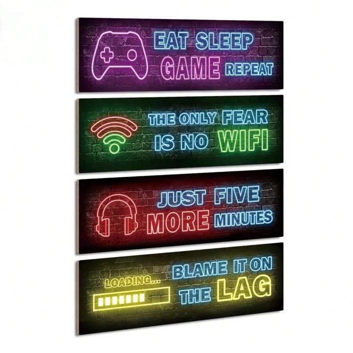4 Pieces Neon Gaming Decor Room Wall Decor Wooden Sign Eat Sleep Game Wall Art Gamer Hanging Plaques for Boys Kids Room Bedroom Playroom Decorations.